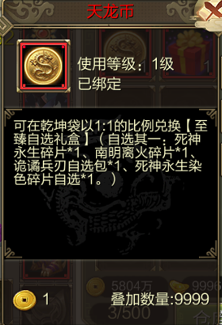 天龙币:可在乾坤袋以1:1的比例兑换【至臻自选礼盒】自选其一:(死神永生碎片*1、南明离火碎片*1、诡谲兵刃自选包*1、死神永生染色碎片自选*1。