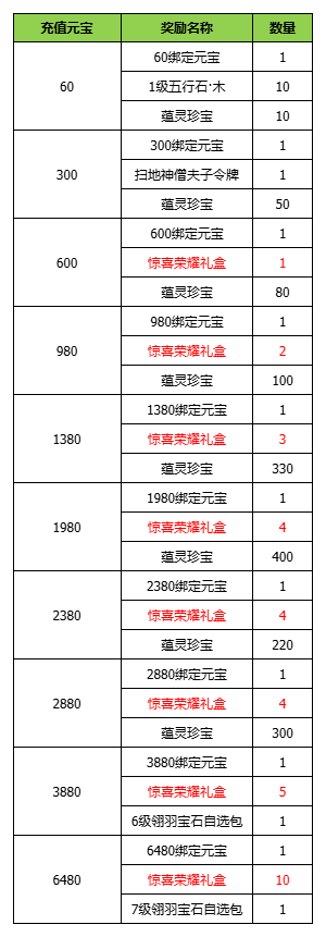 3. 本次充值最高档位6480元宝,所有奖励向上兼容。即充值648RMB可领取所有奖励。