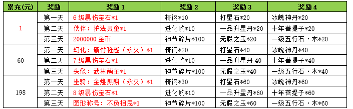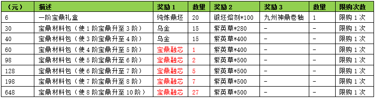 | 礼包 | 开启时间 | 售价(元) | 奖励1 | 数量 | 奖励2 | 数量 | 奖励3 | 数量 |