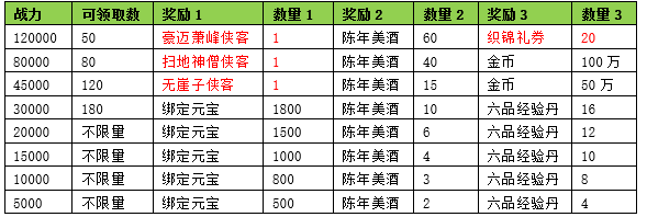 活动期间内玩家拥有的侠客战力达到要求,可以获得对应的奖励。