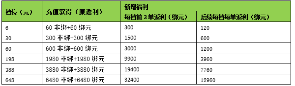 举例:某玩家充值第1单6元,将获得60非绑+60绑元+300绑元;第4单充值6元,将获得60非绑+60绑定+120绑元。