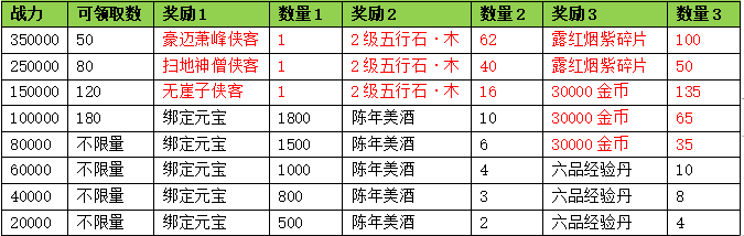 活动期间内玩家拥有的侠客战力达到要求,可以获得对应的奖励。