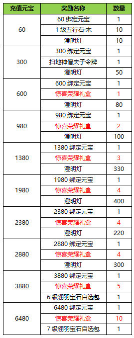 本次充值最高档位6480元宝,所有奖励向上兼容。即充值648RMB可领取所有奖励