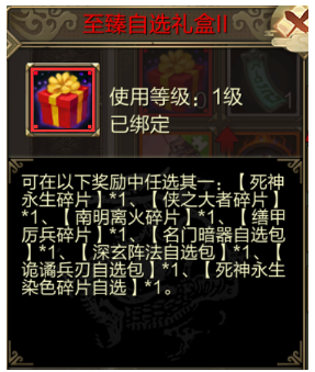 服务器例行维护后迭代至臻自选礼盒II:可在以下奖励中任选其一:【死神永生碎片】*1、【侠之大者碎片】*1、【南明离火碎片】*1、【缮甲厉兵碎片】*1、【名门暗器自选包】*1、【深玄阵法自选包】*1、【诡谲兵刃自选包】*1、【死神永生染色碎片自选】*1。