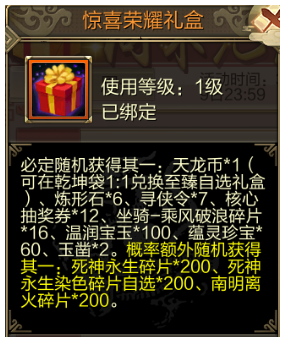 惊喜荣耀礼盒:必定随机获得其一:天龙币*1(可在乾坤袋1:1兑换至臻自选礼盒I)、炼形石*6、寻侠令*7、核心抽奖券*12、坐骑-乘风破浪碎片*16、温润宝玉*100、蕴灵珍宝*60、玉凿*2。概率额外随机获得其一:死神永生碎片*200、死神永生染色碎片自选*200、南明离火碎片*200。