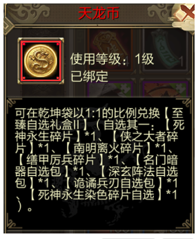 天龙币:可在乾坤袋以1:1的比例兑换【至臻自选礼盒】自选其一:【死神永生碎片】*1、【侠之大者碎片】*1、【南明离火碎片】*1、【缮甲厉兵碎片】*1、【名门暗器自选包】*1、【深玄阵法自选包】*1、【诡谲兵刃自选包】*1、【死神永生染色碎片自选】*1。