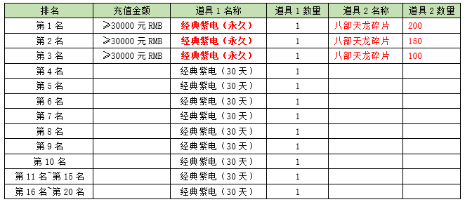 2. 截至活动结束时,每个大区下活动期间累积充值元宝排行1-20名的玩家将获得对应排行榜奖励;