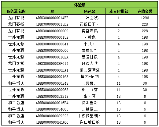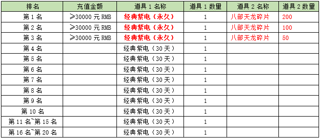 2. 截至活动结束时,每个大区下活动期间累积充值元宝排行1-20名的玩家将获得对应排行榜奖励;