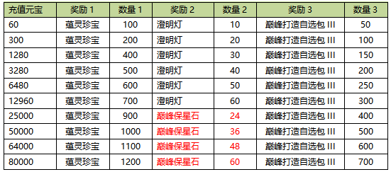 4. 本次充值最高档位80000元宝,所有奖励向上兼容。即充值8000RMB可领取所有奖励。