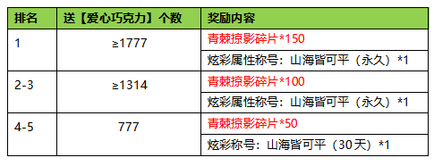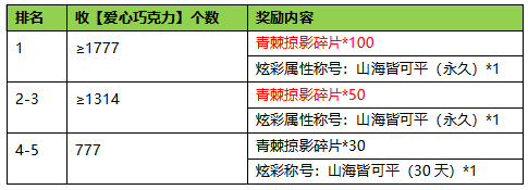 1.活动期间内,全部服务器内的所有玩家累计送“爱心巧克力”个数排名评比,排名前5名且满足次数要求的将获得奖励,奖励内容不向下兼容。
