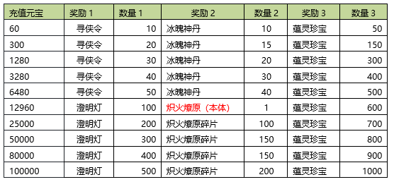 4. 本次充值最高档位100000元宝,所有奖励向上兼容。即充值10000RMB可领取所有奖励;