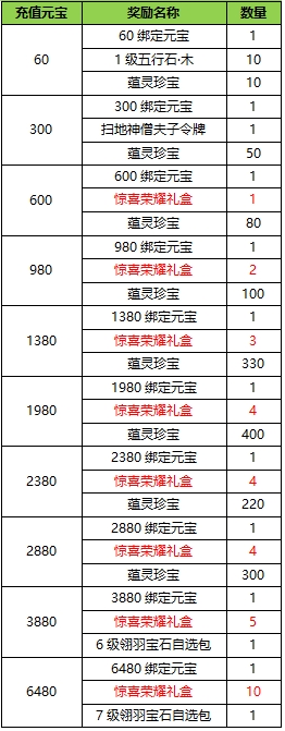 3.本次充值最高档位6480元宝,所有奖励向上兼容。即充值648RMB可领取所有奖励。