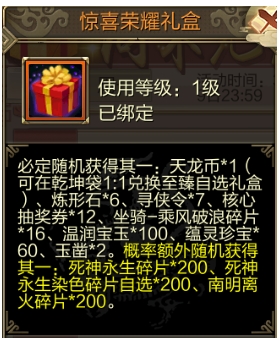 惊喜荣耀礼盒:必定随机获得其一:天龙币*1(可在乾坤袋1:1兑换至臻自选礼盒)、炼形石*6、寻侠令*7、核心抽奖券*12、坐骑-乘风破浪碎片*16、温润宝玉*100、蕴灵珍宝*60、玉凿*2。概率额外随机获得其一:死神永生碎片*200、死神永生染色碎片自选*200、南明离火碎片*200。