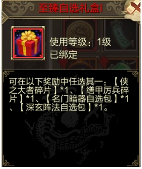 至臻自选礼盒I:可在以下奖励中任选其一:【侠之大者碎片】*1、【缮甲厉兵碎片】*1、武学招式【名门暗器自选包】*1、武学招式【深玄阵法自选包】*1。